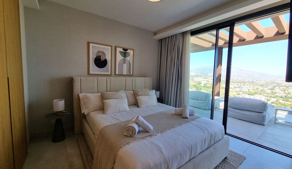 This villa is located an exclusive gated urbanisation in Benahavis, with sensational views across the coastline and the famous Marbella mountain, La Concha. The house is on a lovely corner plot and is part of a new complex of only 13 villas, each with a private garden and pool. The distribution of this villa covers 2 main floors plus a basement and a solarium.